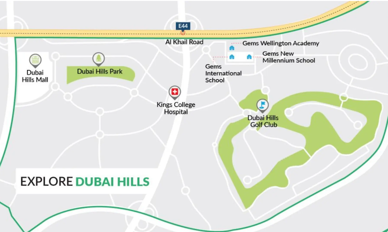 • Community amenities such as Dubai Hills Mall, Dubai Hills Park, and Golf Clubhouse.